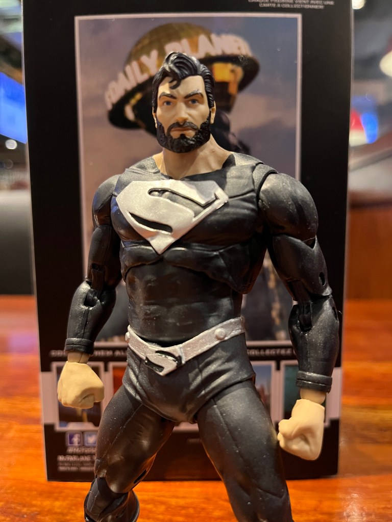So this afternoon I got myself a brand new Superman action figure from McFarlane, the black and silver version! The brief history of this version in the comic books is thus: in 2015, there was a cataclysmic event that THREATENED TO SHAKE THE MULTIVERSE (of course!), called Convergence. As a result, past versions of characters all came together and fought each other. The DC Comics offices were transferring from NYC to Burbank that year, so they needed a huge “event” where the stories don’t require sophisticated writing and characters just shoot beams at each other.