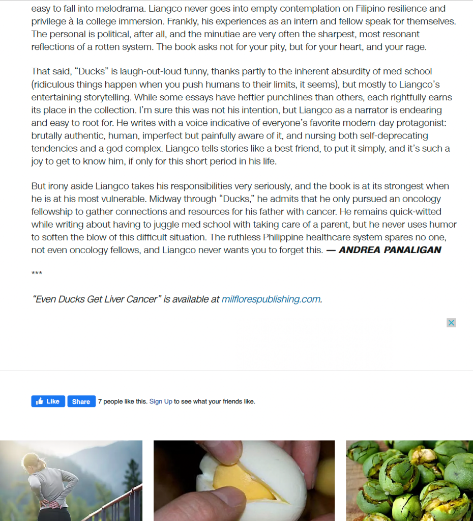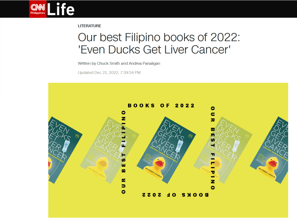 I’m posting here CNN Philippines’ December 2022 article about Even Ducks Get Liver Cancer being one of their 2022 Best Books, written by Chuck Smith and Andrea Panaligan. Other featured books were How To Grieve by Jade Capinanes, and Dear Meg.